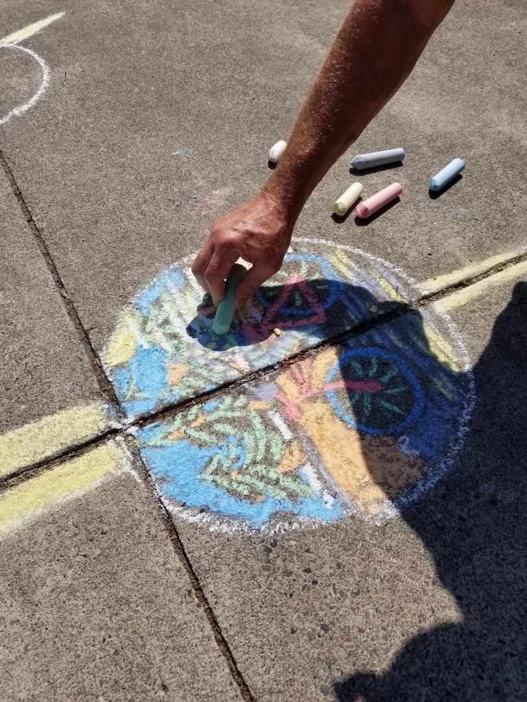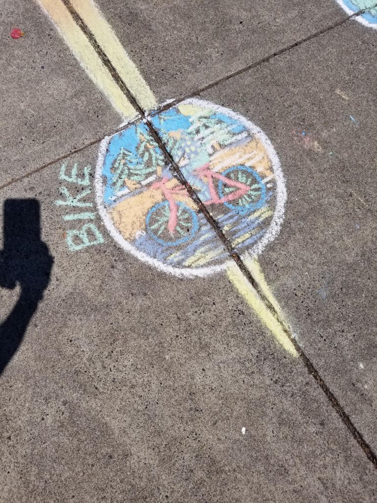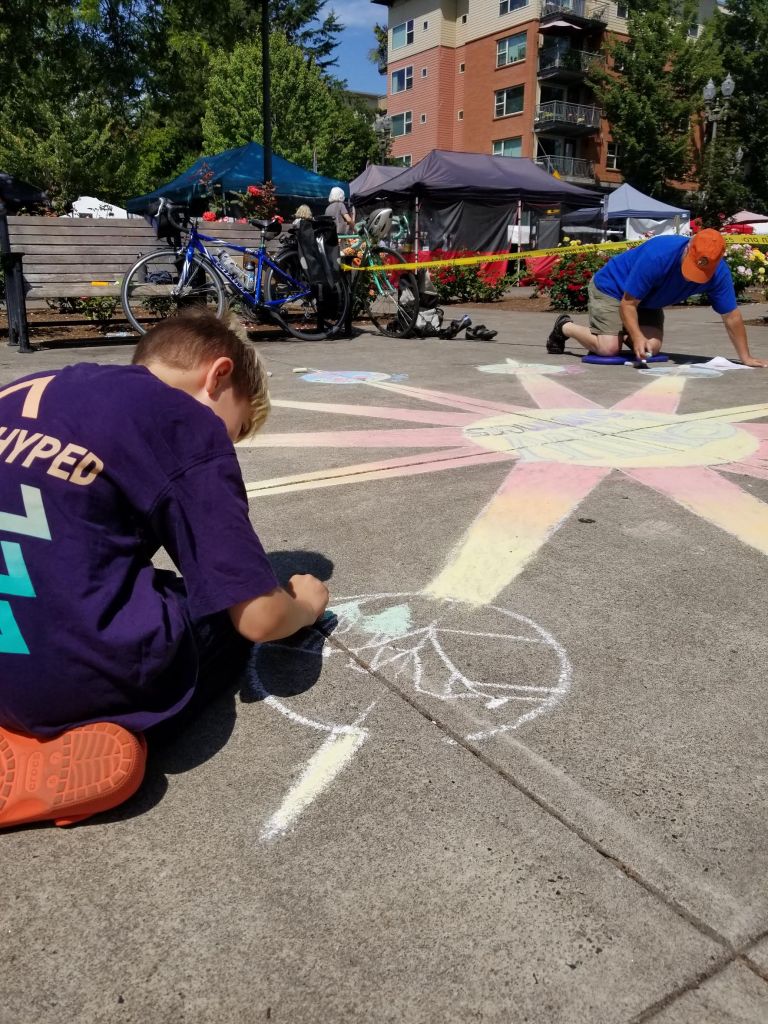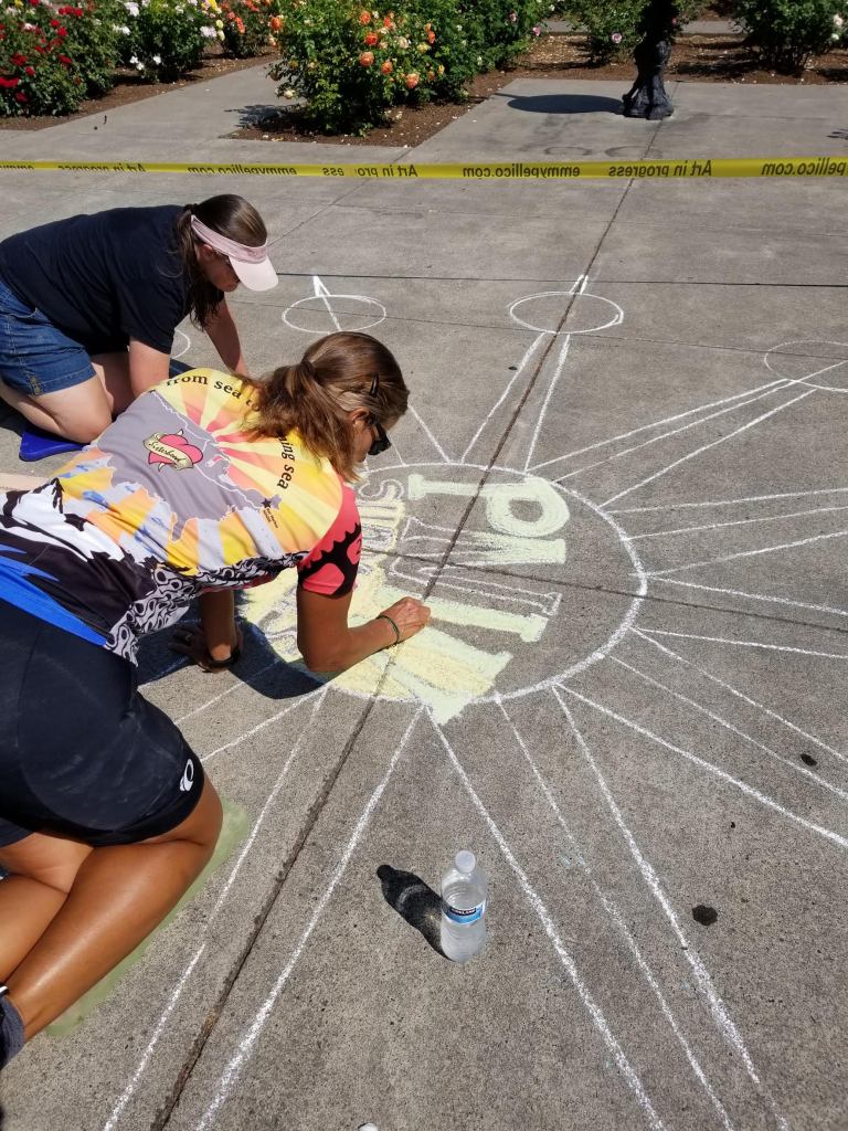 I am so thankful that I have a supportive group of friends and family that came out to help and encourage me. My goal is to ride my bike to my selected location with a plan, and the supplies ready to engaged others and to create. Laura Schroeder rode with me from my home in Brush Prairie and helped me with the basic layout. She is a great friend and cycling sister who helped me a lot with the first public chalk art project in early July! See post: “United We Create.”