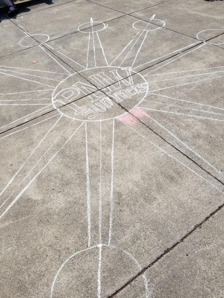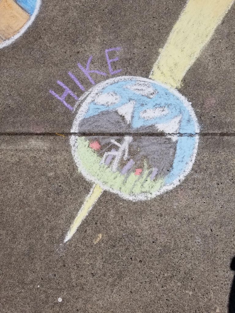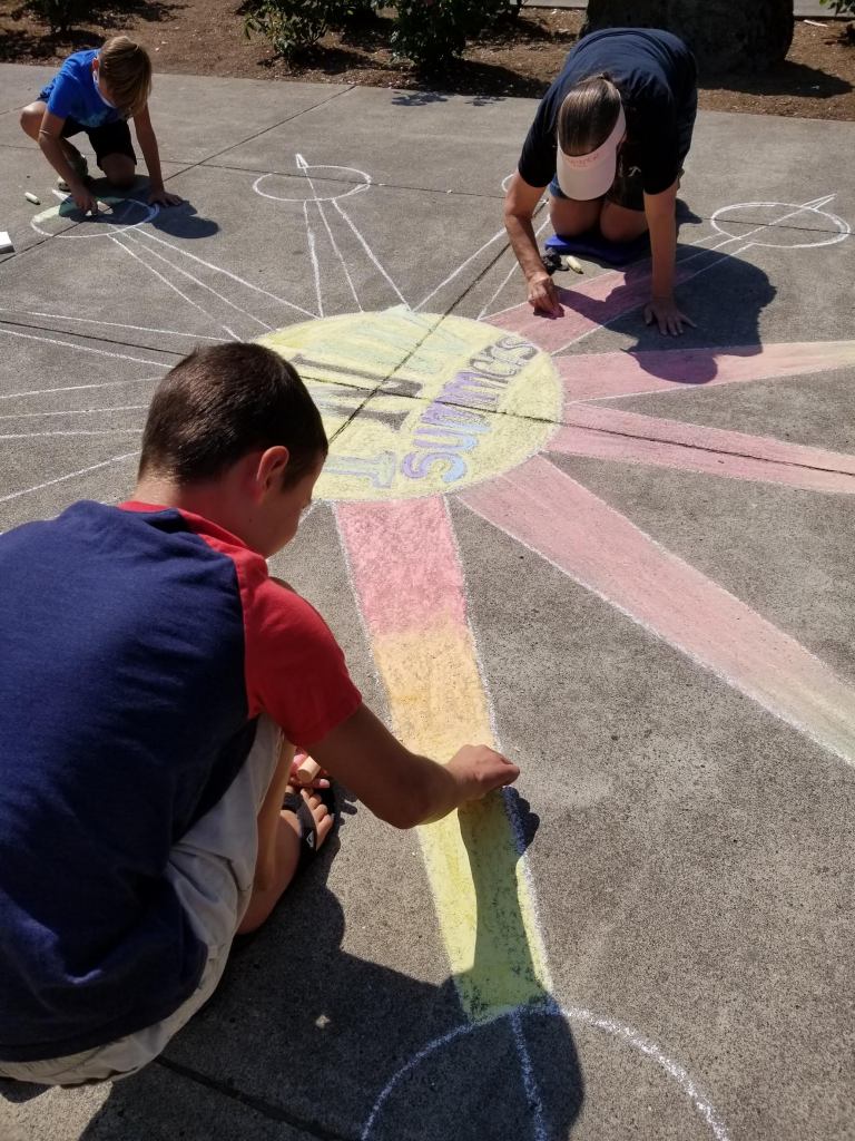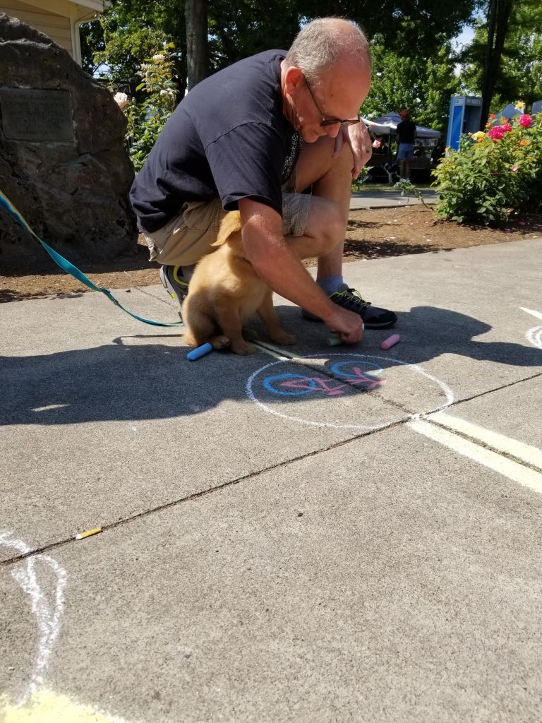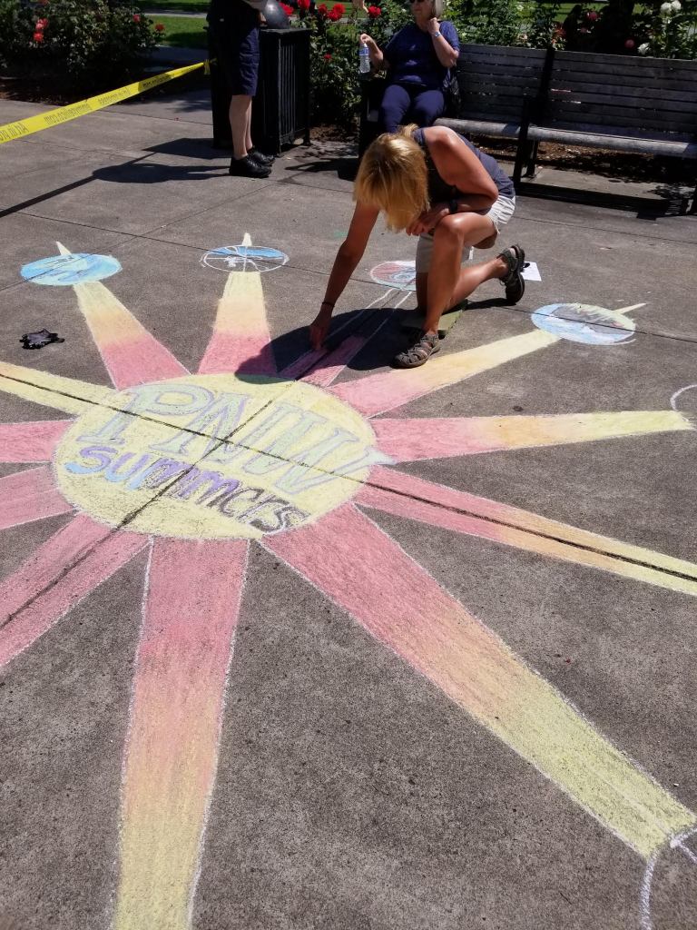 I am so thankful that I have a supportive group of friends and family that came out to help and encourage me. My goal is to ride my bike to my selected location with a plan, and the supplies ready to engaged others and to create. Laura Schroeder rode with me from my home in Brush Prairie and helped me with the basic layout. She is a great friend and cycling sister who helped me a lot with the first public chalk art project in early July! See post: “United We Create.”