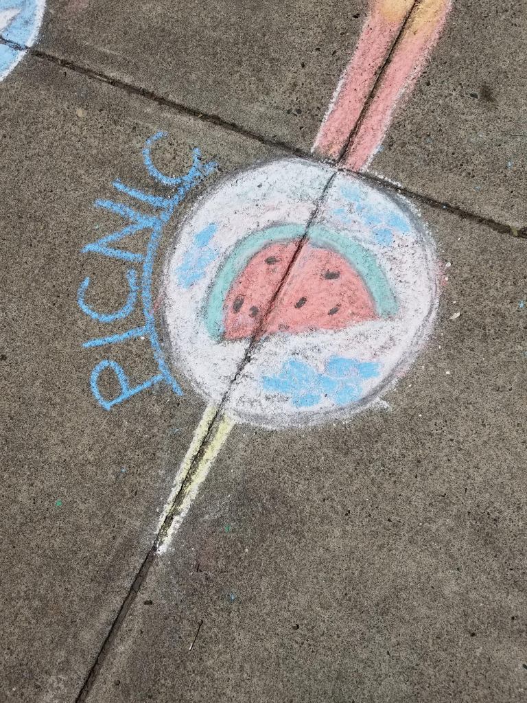 The community chalk art project at Esther Short Park this Sunday was another hot one! The Vancouver Farmer’s Market, brought lots of foot traffic. I selected a location and area of concrete between the Slocum House and the playground, however the direct sunlight made for rather hot working conditions.