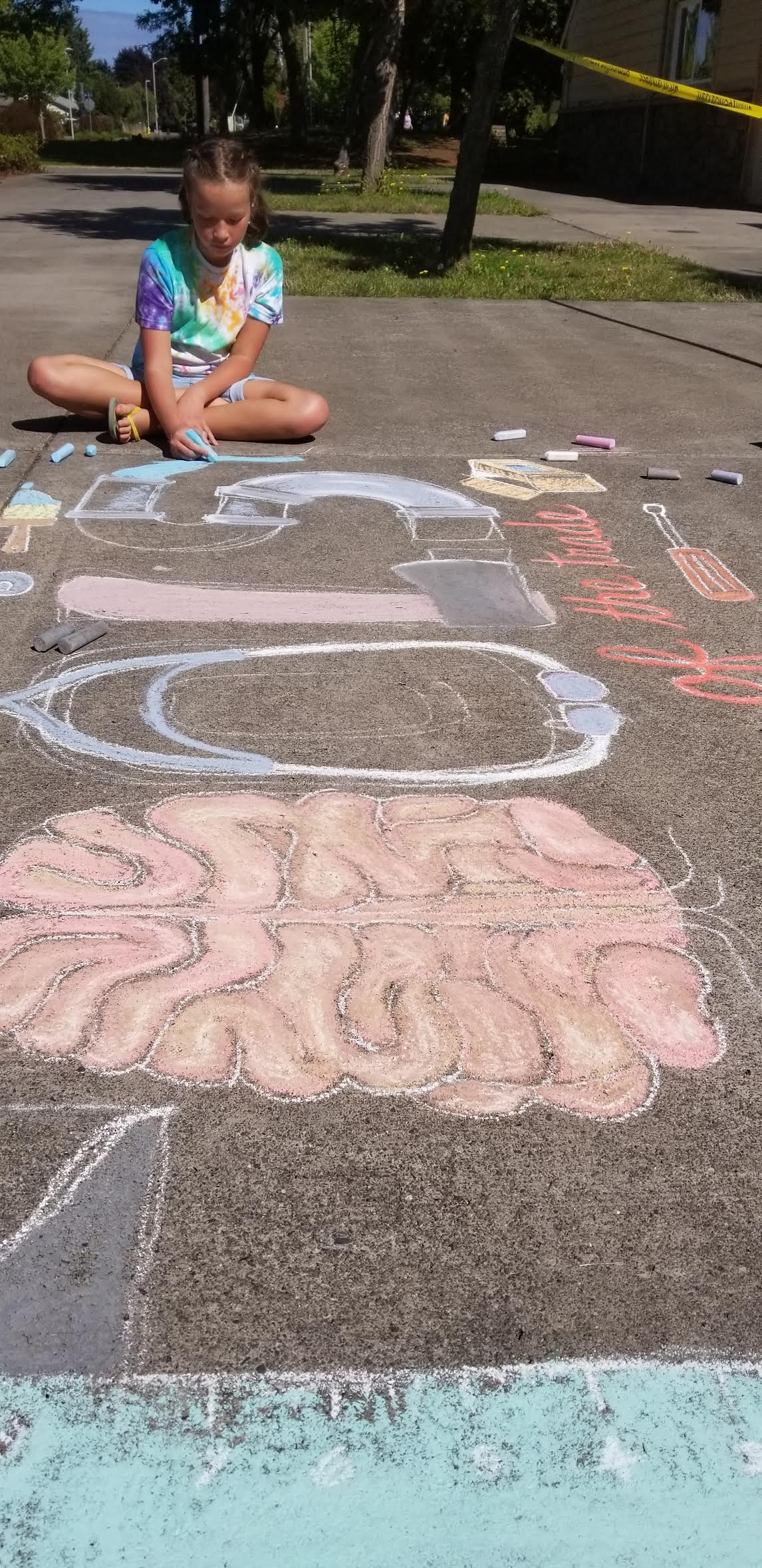 I was particularly pleased to have my youngest son, Nicholas, volunteer to bicycle out with me and help me get started. I also enjoyed help from members of the Dietel family who were using the Kiwanis Park in Battle Ground for their annual family picnic. My close friend Laura Schroeder told me about her family event as she thought it might inspire participation from some of the younger and creative members. I found lots of good help from Sayrn, Mila and Lilly. I even had help from Avi, a very young member of the Dietel clan. At about two years old it was a challenge to keep her engaged and productive to the artistic plan. Thanks to her older cousins, she was kept busy with her own chalk “side” projects.