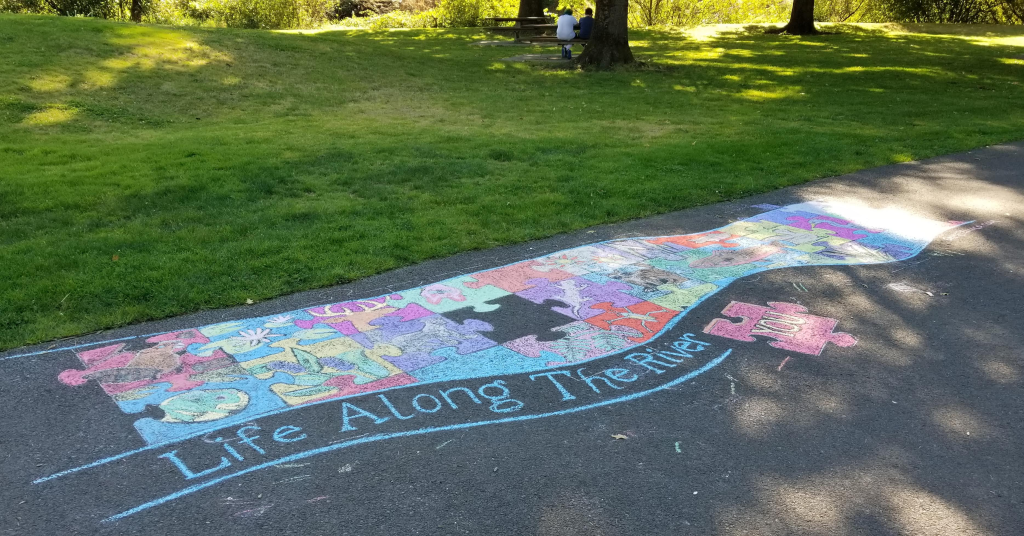 We depend on our rivers and streams. So do a copious amount of other living things. This chalk art project completed in the Salmon Creek Regional Park by Klineline Pond is a tribute to those waterways.