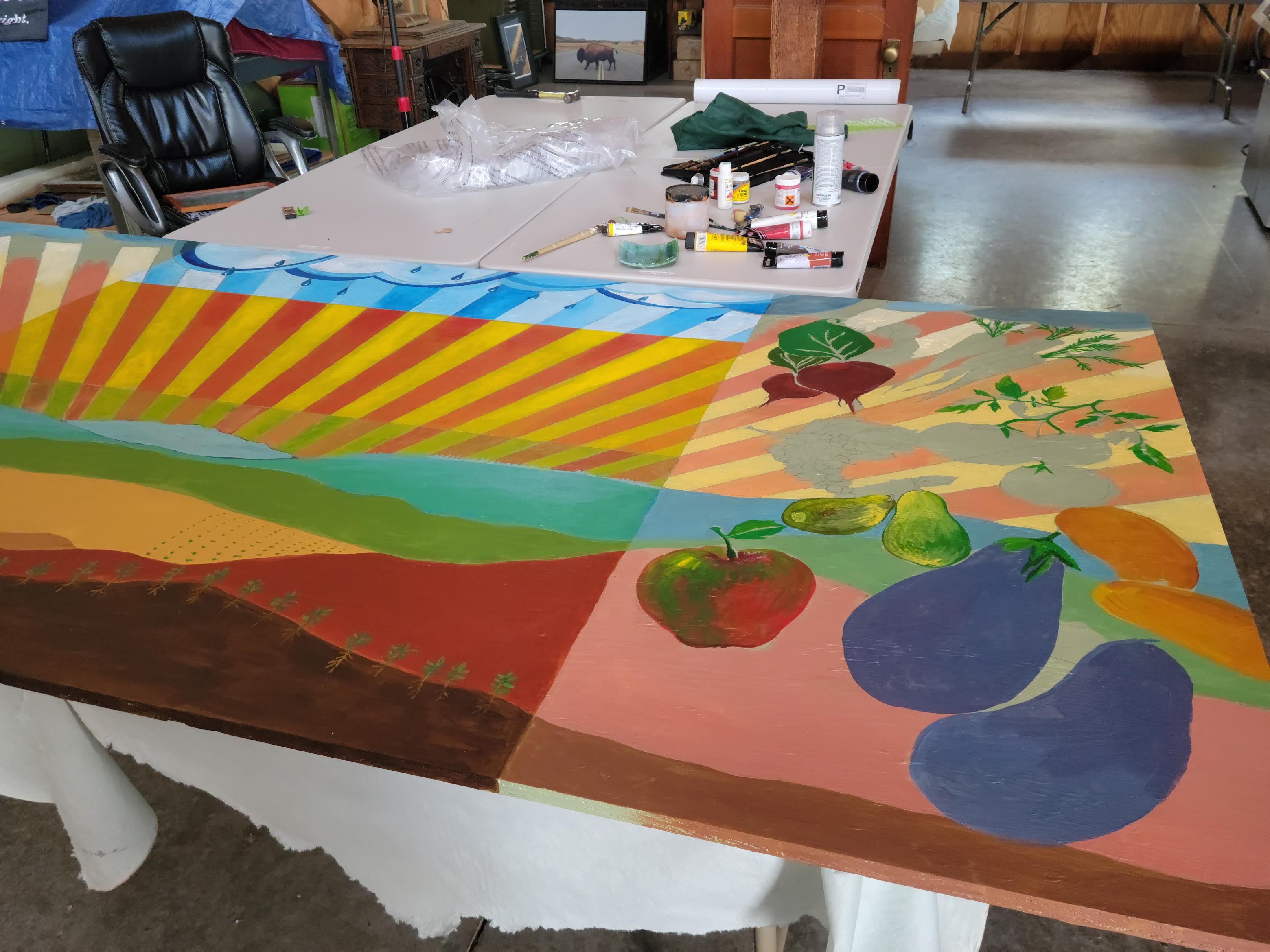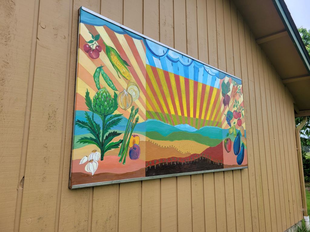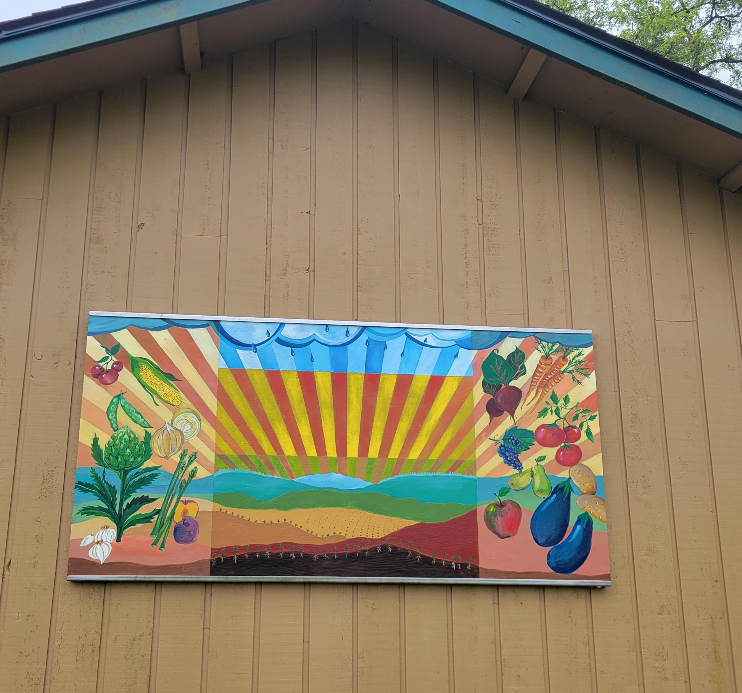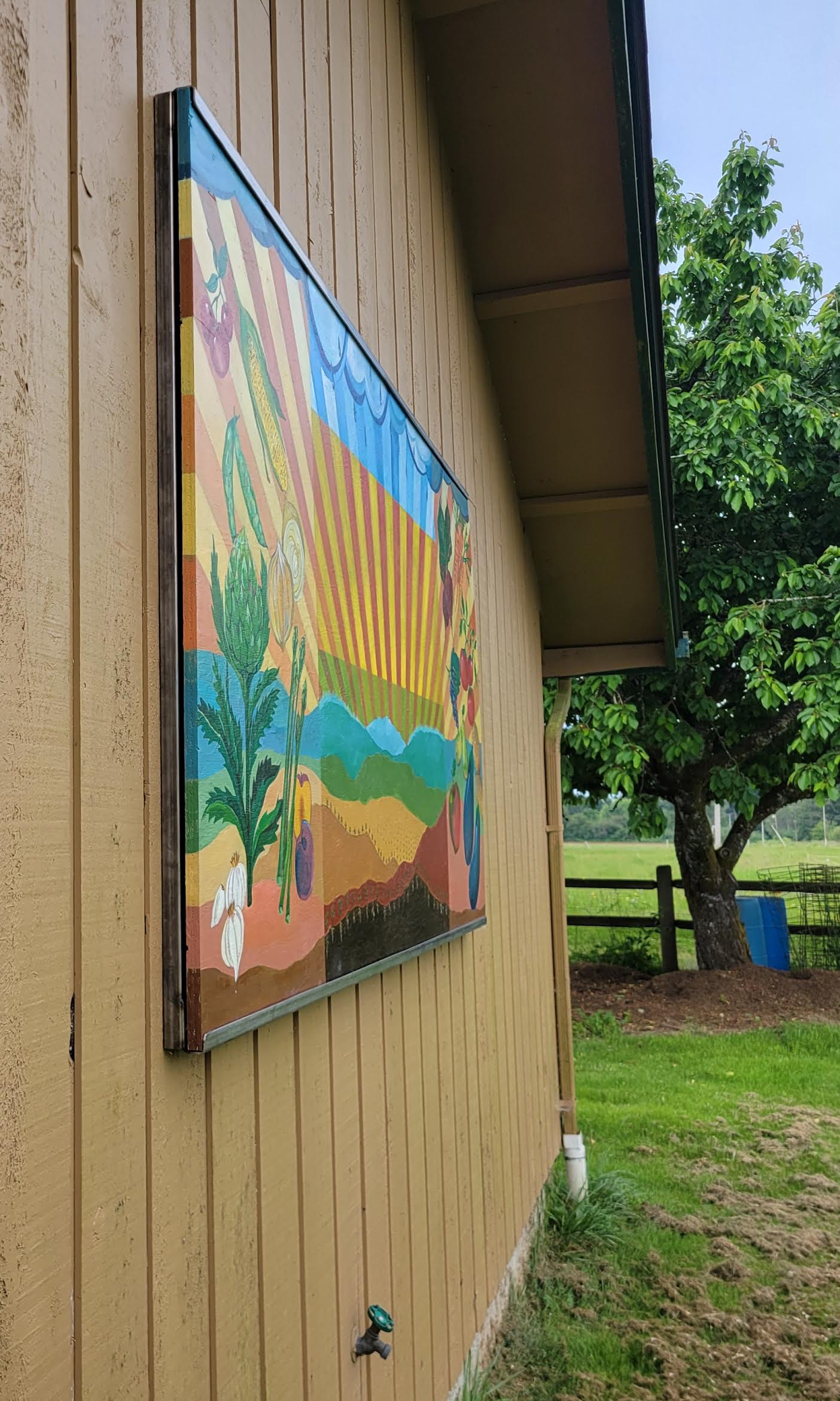 My home is fairly plain on the outside and I thought a mural could add some interest. Rather than paint directly on my cedar siding, I decided to attach the finished art via a metal frame. I have always enjoyed how rich a painting looks when done on wood, but I had never undertaken such a large scale project. I used a 4 x 8 sheet of plywood to create what I call the “Garden Mural.” Positioned to face my vegetable garden, it is broken into five segments. The middle three represent rain, sun, and soil. The most important features for growing good food. The larger two side segments showcase the bounty of the garden. Now when I drive into my home or work in my garden, I am greeted by the bright colors of this work. By installing in a frame, I have the option to change out this mural in the future.