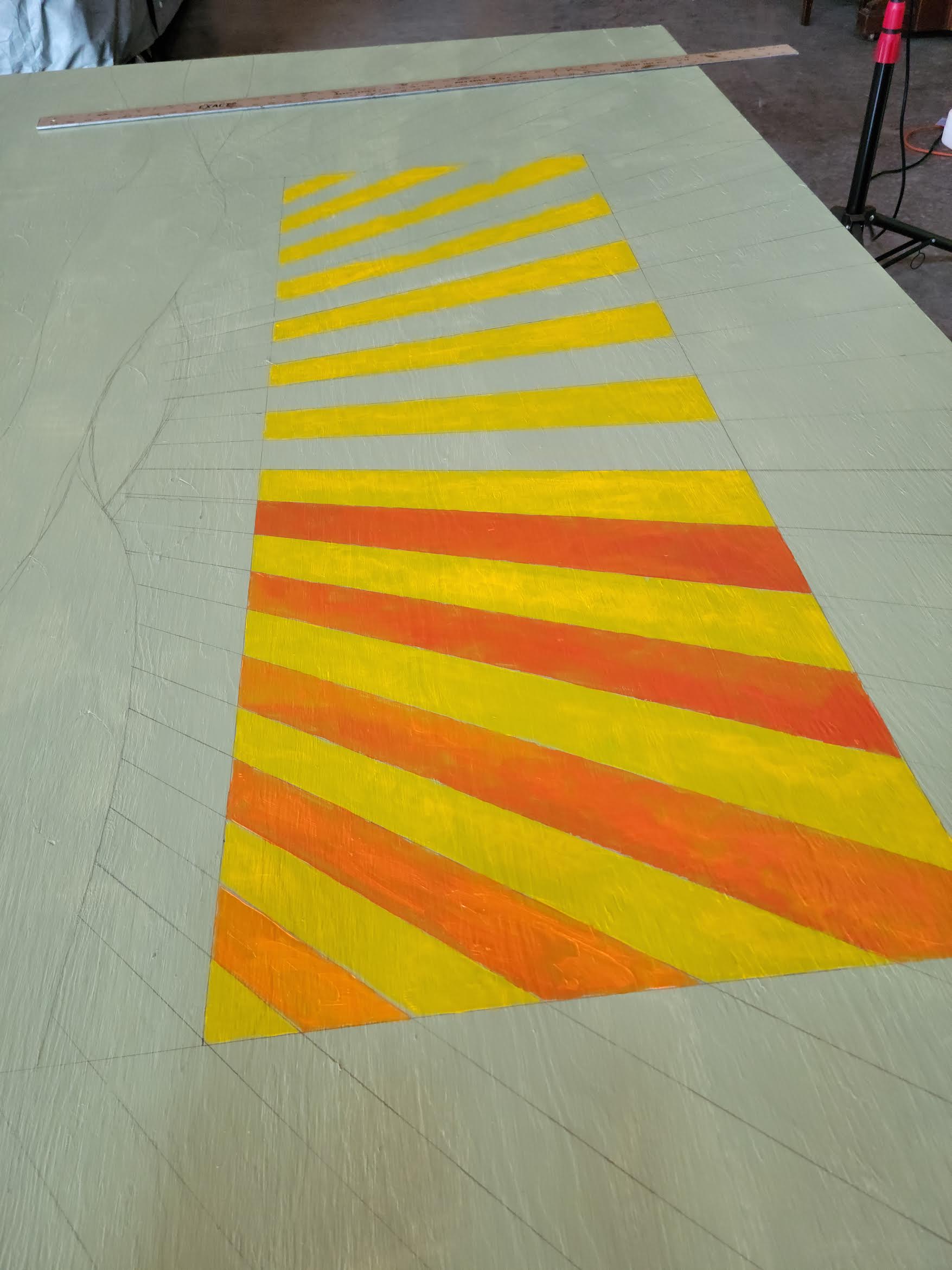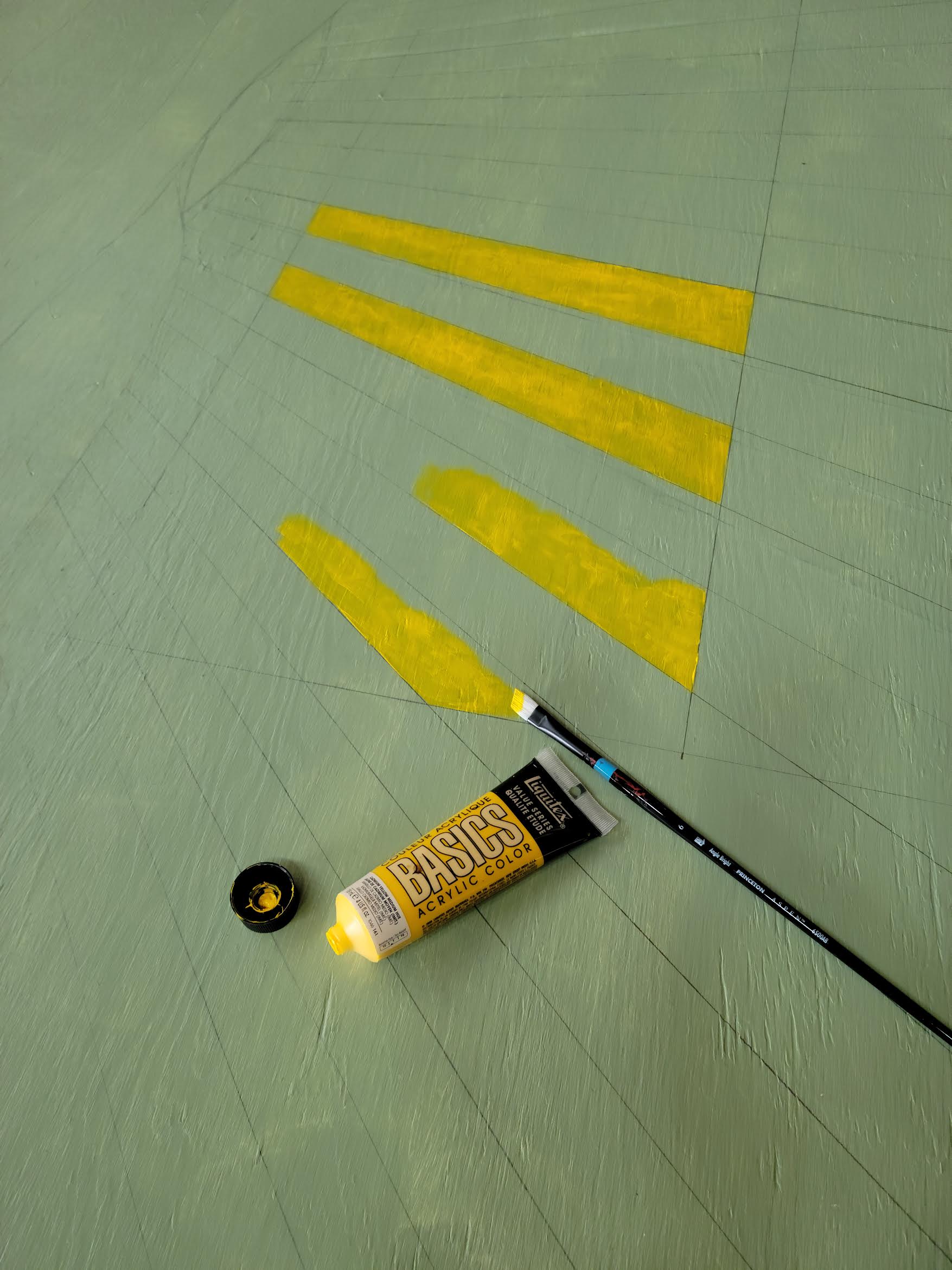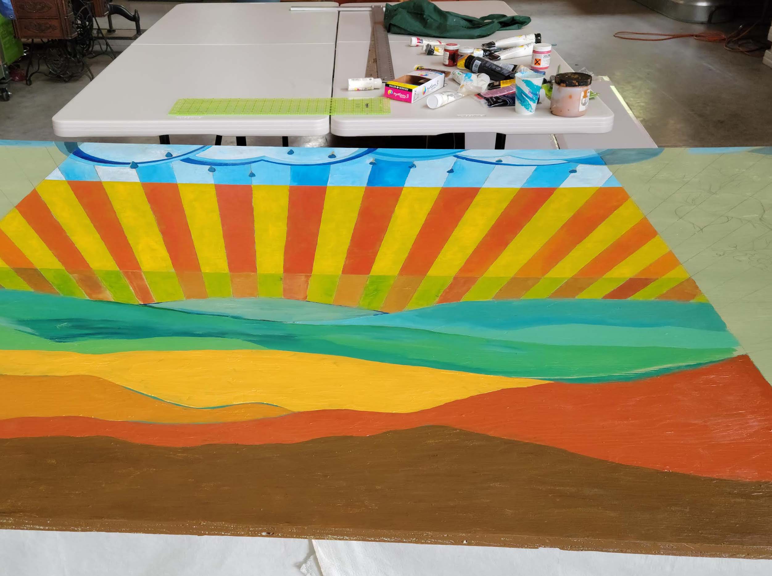 My home is fairly plain on the outside and I thought a mural could add some interest. Rather than paint directly on my cedar siding, I decided to attach the finished art via a metal frame. I have always enjoyed how rich a painting looks when done on wood, but I had never undertaken such a large scale project. I used a 4 x 8 sheet of plywood to create what I call the “Garden Mural.” Positioned to face my vegetable garden, it is broken into five segments. The middle three represent rain, sun, and soil. The most important features for growing good food. The larger two side segments showcase the bounty of the garden. Now when I drive into my home or work in my garden, I am greeted by the bright colors of this work. By installing in a frame, I have the option to change out this mural in the future.